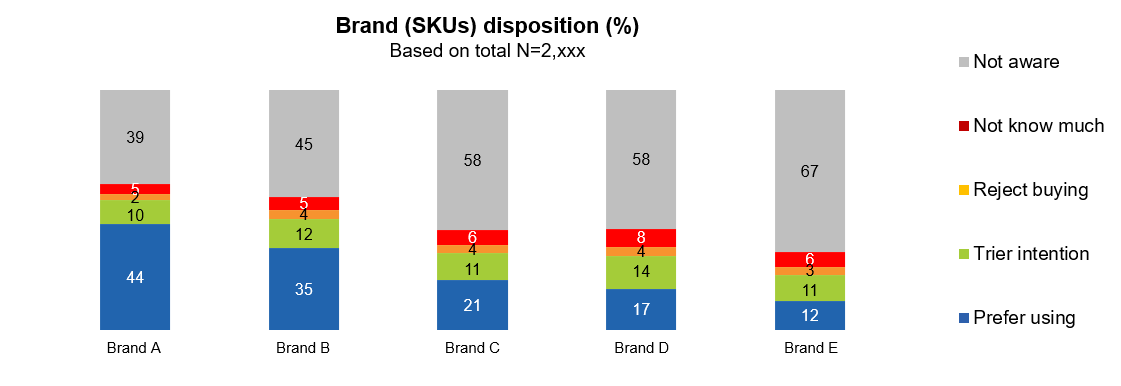 Xét về thái độ của người tiêu dùng đối với thương hiệu (Brand disposition), Brand A tiếp tục thể hiện vị thế mạnh nhất khi có tới 49% người tiêu dùng ưu tiên sử dụng, đồng thời tỷ lệ người từ chối mua thấp. Brand B theo sát với 35% người tiêu dùng cho biết ưu tiên sử dụng, cho thấy đây là thương hiệu có khả năng cạnh tranh trực tiếp.