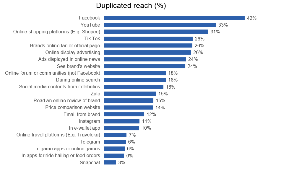 Người tiêu dùng được hỏi về các kênh mà họ biết đến thương hiệu, với khả năng chọn nhiều đáp án. Phân tích cho thấy Facebook là kênh có độ tiếp cận cao nhất, do đó nên được ưu tiên đầu tư đầu tiên. Tuy nhiên, nếu tiếp tục đầu tư vào YouTube ngay sau đó mà không loại trừ những người đã tiếp cận qua Facebook, mức độ trùng lặp sẽ cao và hiệu quả giảm.