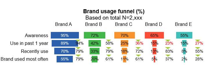 - Các thương hiệu như Brand C và Brand D có tiềm năng tăng trưởng nhưng đang bị nghẽn ở giai đoạn chuyển đổi từ nhận biết sang dùng thử, đòi hỏi chiến lược tập trung vào việc giảm rào cản trải nghiệm ban đầu.