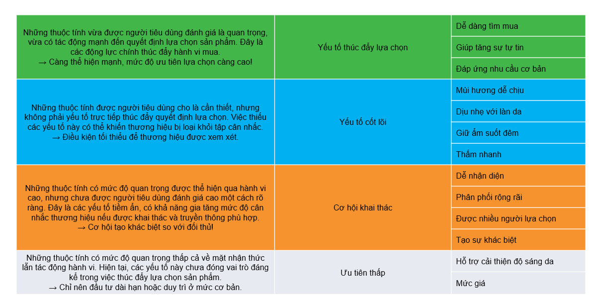 Sau khi hoàn tất phân tích, thương hiệu cần ưu tiên củng cố nhóm Yếu tố thúc đẩy lựa chọn, đồng thời cân nhắc khai thác có chọn lọc các đặc tính thuộc nhóm Cơ hội khai thác và Yếu tố nền tảng, đặc biệt là những đặc tính mà đối thủ cạnh tranh đang yếu hoặc chưa đầu tư đáng kể.