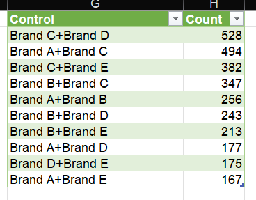 Sau khi xử lý dữ liệu bằng Power Query, kết quả cho thấy tổ hợp Brand C và Brand D mang lại mức độ tiếp cận không trùng lặp cao nhất. Phương pháp này có thể được mở rộng để áp dụng cho nhiều SKU khác nhau của cùng một thương hiệu, hỗ trợ ra quyết định trong chiến lược danh mục sản phẩm.